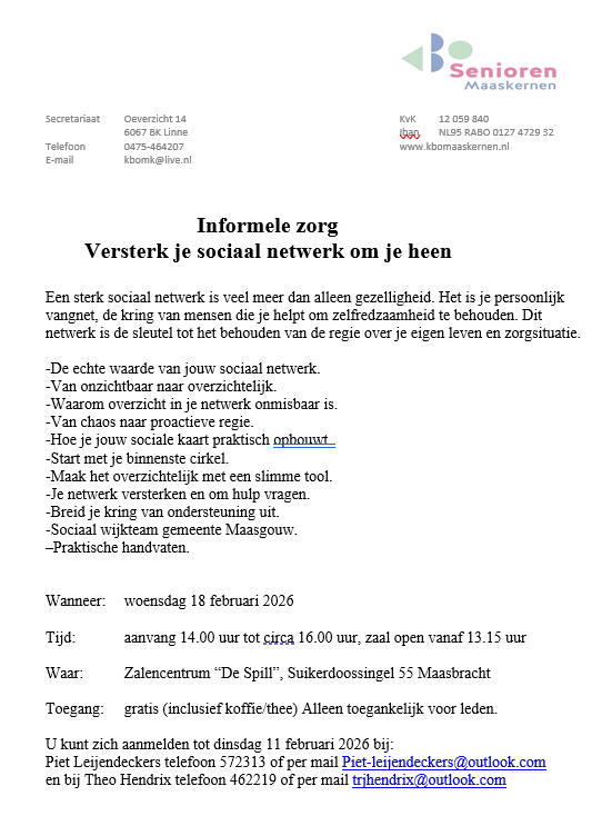 Bijeenkomst Alzheimer Café Maasgouw op maandag 9 februari 2026 van 19.30 tot 21.30 uur, inloop vanaf 19.00 uur, in Gemeenschapshuis ’t Leuke, Leukenstraat 6 in Beegden